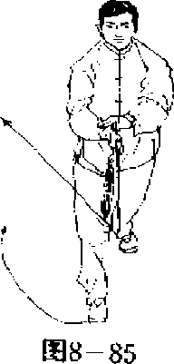 重心在左脚,提右脚向正西上一步,脚尖后撇,重心移向右脚, 提左脚成独立势,同时,左剑指附于右腕助力,双手提剑的东下向 西上提起上架,剑尖下垂与地面45度,目透过剑身远视。(图8— 86)