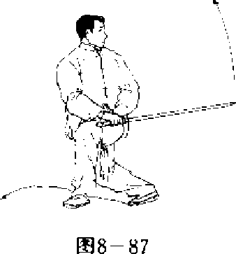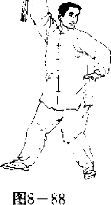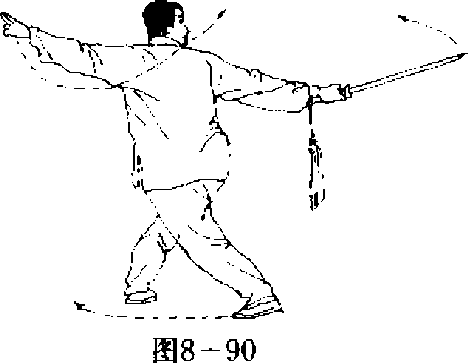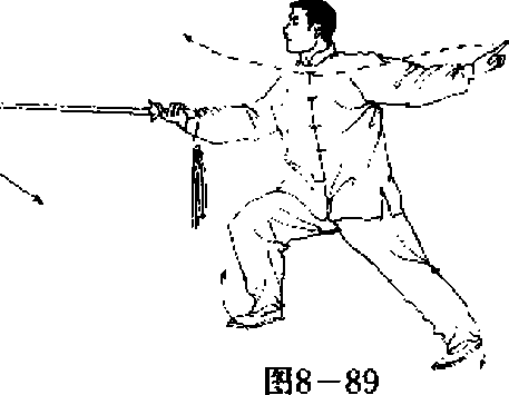 由上向前劈出,左剑指伸出于左侧,目视前方。(图8—87、图8- 噩、图8—89)