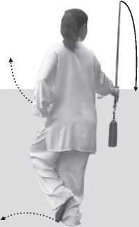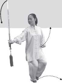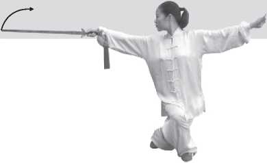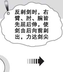 身体继续右转,左脚收至右脚 内侧(脚尖不点地),右手持 剑在身体右侧向上、向后、向 下划立圆至右胯旁,剑身斜立 在身体右侧,左剑指绕至右胸 前,眼随剑走,转右后方