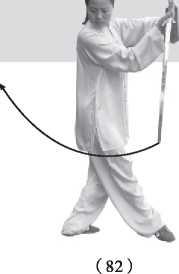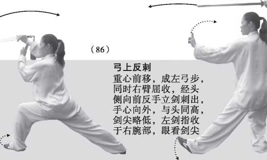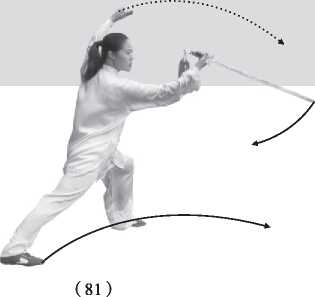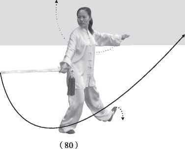 (78) 身撇脚绕剑 B重心略后移,右脚尖外撇 身体微右移,同时右剑上 指,向后方回绕,左剑指 附于右腕部,眼看前方(78) 身撇脚绕剑 B重心略后移,右脚尖外撇 身体微右移,同时右剑上 指,向后方回绕,左剑指 附于右腕部,眼看前方