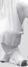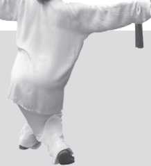 身体微左转,左脚向左前方 迈出一步,脚跟落地,同时 右手持剑向下向前划弧,手 心向外,左剑指落于腹前, 眼看右下方