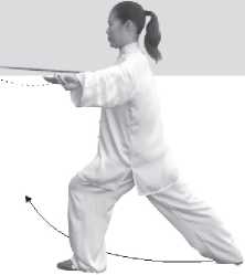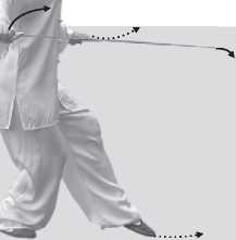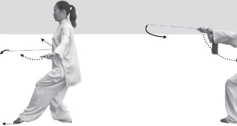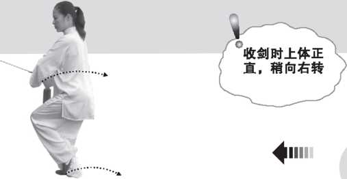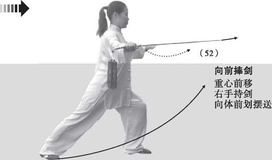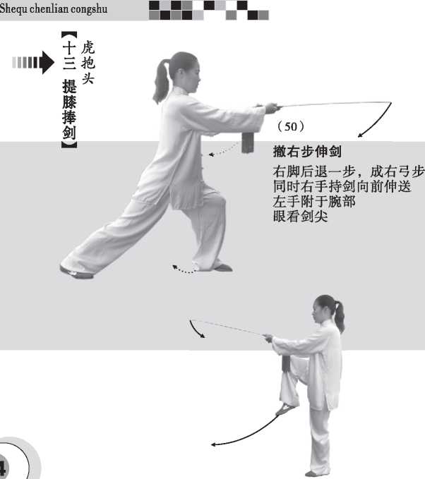 重心移向左腿 右脚收至脚内侧 脚尖点地社区晨练丛书(51)虚步分剑重心后移,左脚微向后移 脚尖着地,成左虚步,同 时两臂向两侧分开,手心 向下,剑斜置于身体右侧 剑尖向前,眼看前方(51)