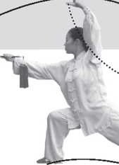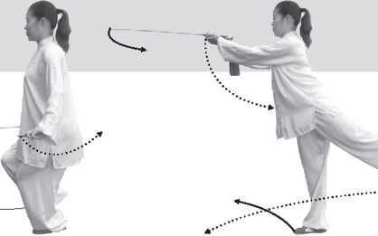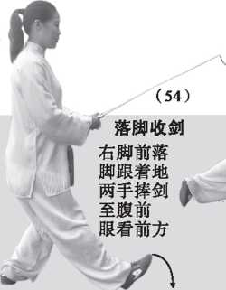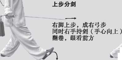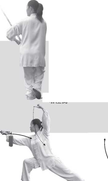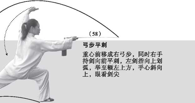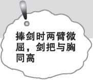 右膝向前提起成独立步 右手持剑继续向前划弧 伸送,左剑指变掌捧托 在右手背下面,两 臂微屈剑身直向 前方,剑尖略高 眼看前方