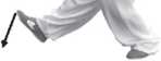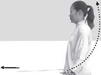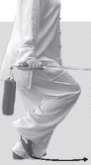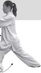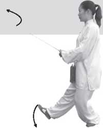左脚随即前跨一步踏实 右脚迅速向左小腿内侧收拢 同时两手撤至身体两侧, 手心向下,左手变剑指, 眼看前方