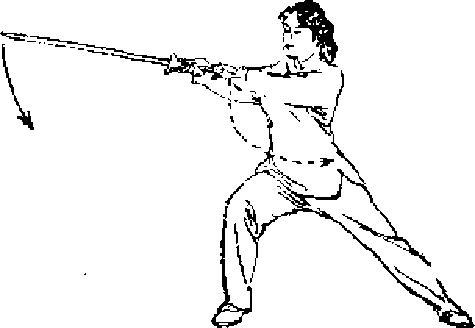 3 .弓步带剑.重心前移,右脚踏实成右弓步手右手持 剑,手心翻转向下,向右后方斜带?剑指仍附于右胸$眼看 剑尖(图一 24)。