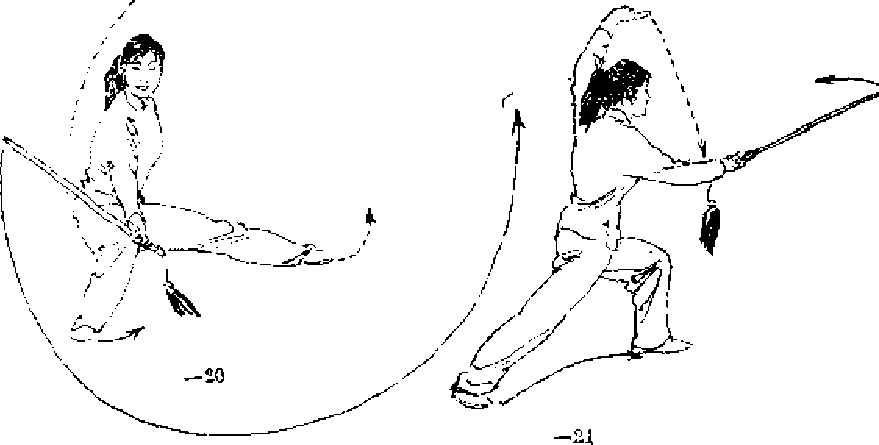 2 .仆步扫剑:身体左转,左剑指经体前顺左肋向后反 插,并向左上方划弧举起,手心斜向上;右手持剑,手心转向 上,使剑自右后方向下、向左前方划弧平扫,右膝弯屈下噂 成半仆步,随着重心逐渐左移,左脚尖外撤,左腿屈弓,右 脚尖内扣,右腿自然伸直,成左弓步多定式时剑高与胸平} 眼看剑尖(图-20* -21).