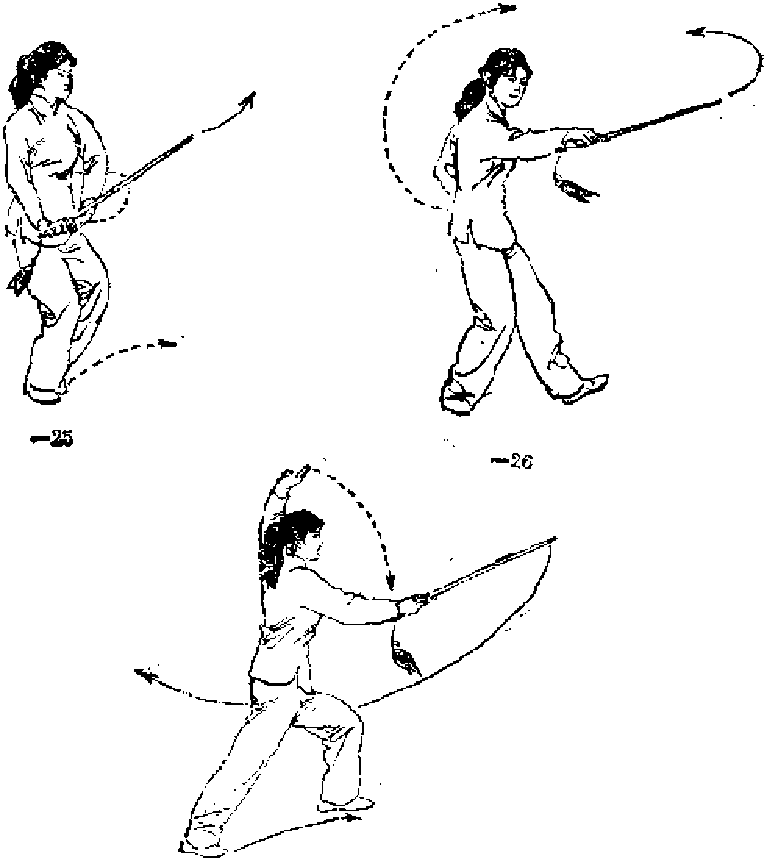2 .上步送剑;左脚向左前方上步,脚跟着地s右手持 剑向前伸展)左剑指翻转收至腰间手眼看剑尖(图一26,