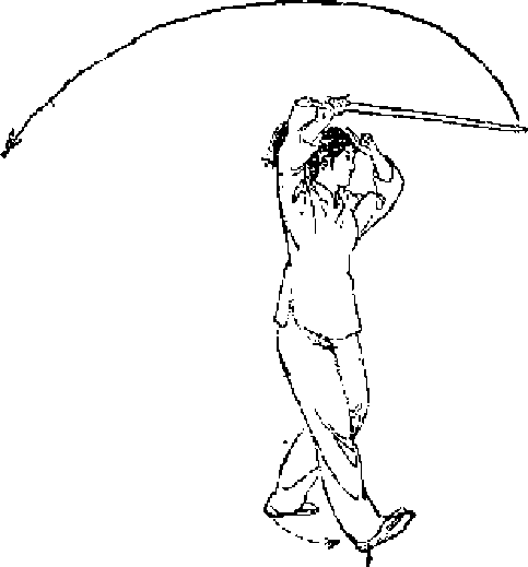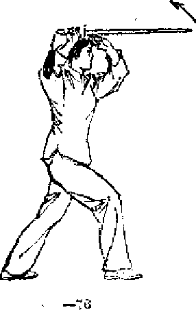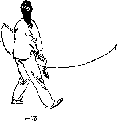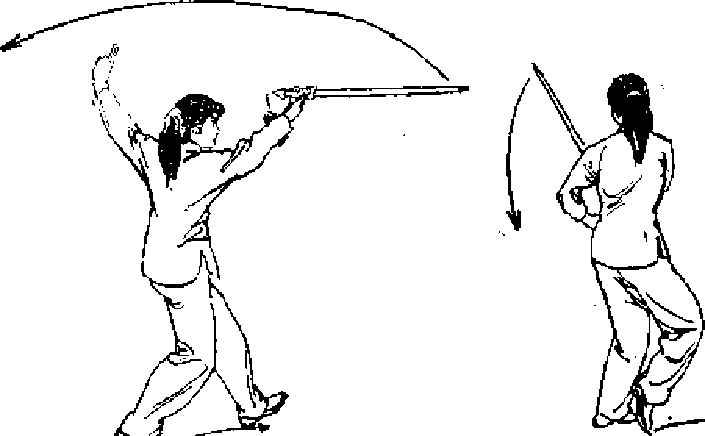 1.撇脚绕剑.重心略后移,左脚尖外撇,身体微左 转,同时右手持剑上举,开始向左后方回绕#眼看右手(图 -73).
