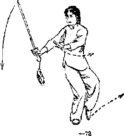 立圆绕至右聘旁,剑身斜立在身体右侧y左剑指绕至右胸 的;般随剑走,转看右后方(图一78).
