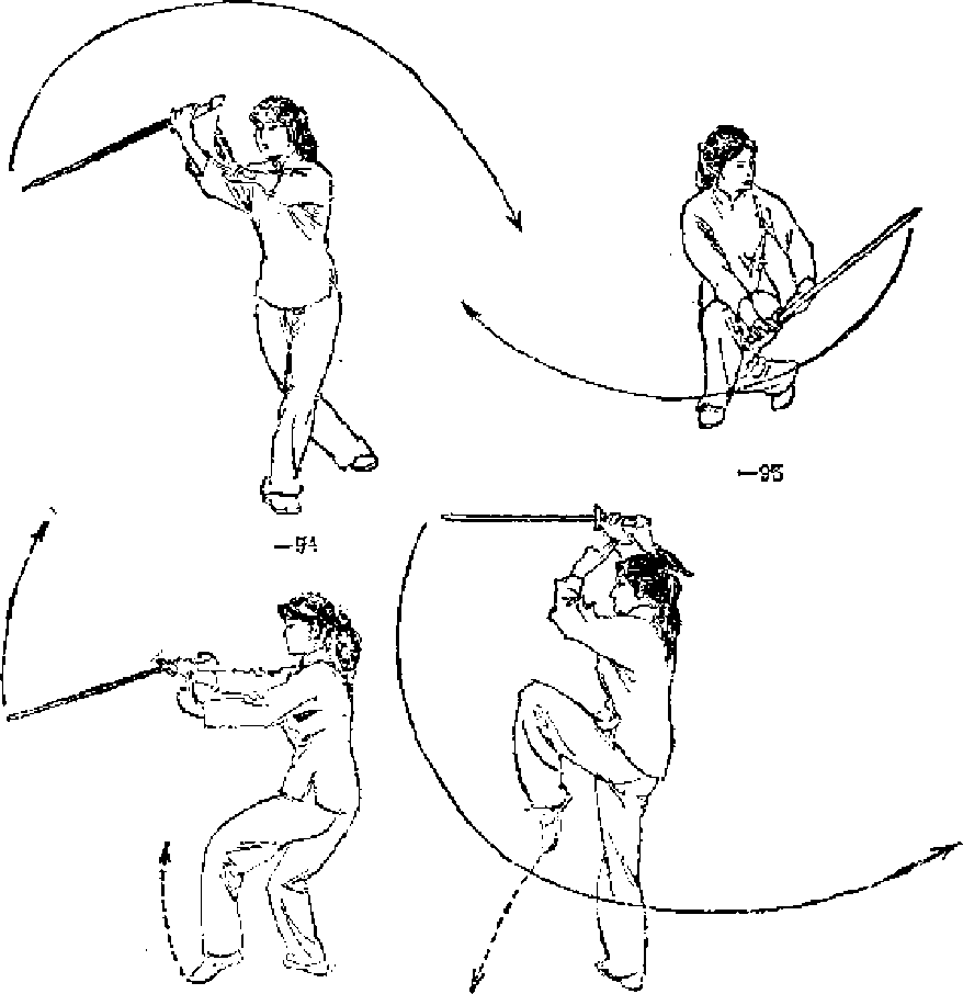 两腿屈膝半蹲;同时右手外旋持剑在体前由右向上,向左绕 环,剑把落在左腰前,手心向里,剑身置于体左侧,剑尖到向左 上方;左剑指附于右腕随右手环绕*眼看剑尖(留一 94、一 95工