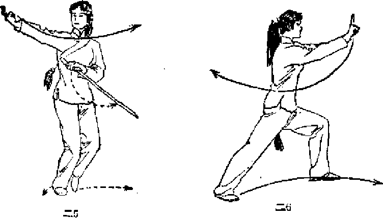 5.上体左转,左脚向前(正东)迈步,右腿自然伸直 成左弓步。同时左手持剑向下、向前经体前摆至左髓旁,剑 直立贴于左臂后手右手经耳旁向前指出。目视前方(图二6)。
