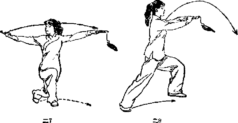 U 身体右转,右脚向前上步步脚尖外展,两腿屈膝半 蹲口左手持剑屈肘上提,经右前臂上向前穿出,手心向下j 右臂外旋,手心转向上.并向下,向右后摆*目视右手(图 二7 k