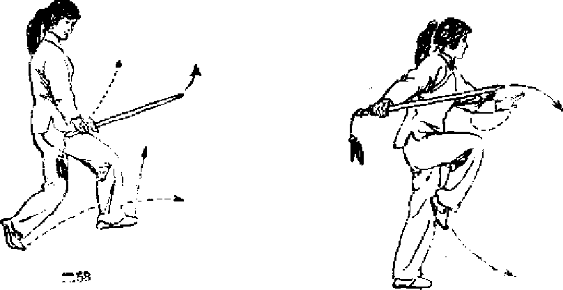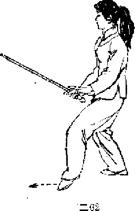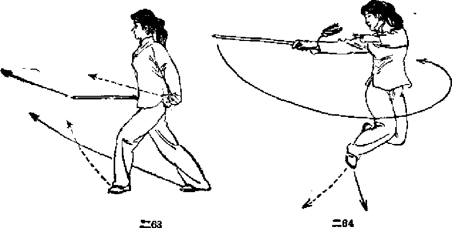 1 .身体左转,重心移至左腿,右脚尖内扣。同时右臂内 旋。右手持剑随转身向左划弧$左手仍扶于右腕《图二61”