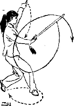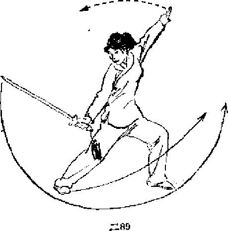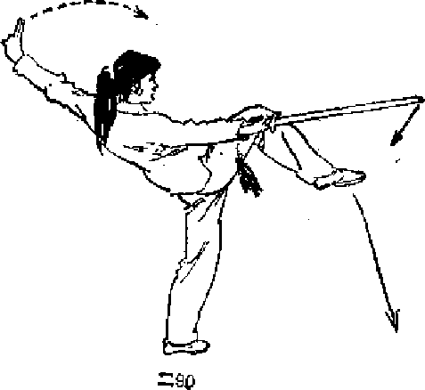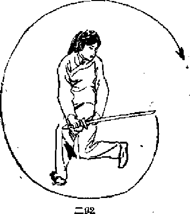 1 .右脚下落,脚尖外撇,左脚跟提起「而腿略蹲,同. 时右手持剑下沉,手心向上。目视剑尖(图二91)。