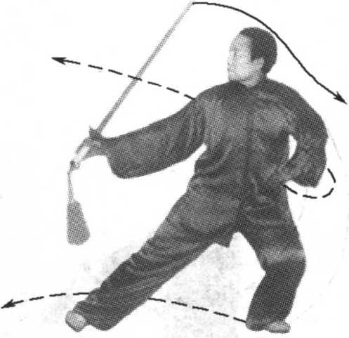 (2)落地和收剑要同时完成,剑身藏在左前臂 下,剑尖与左肘尖、目视方向皆向西。