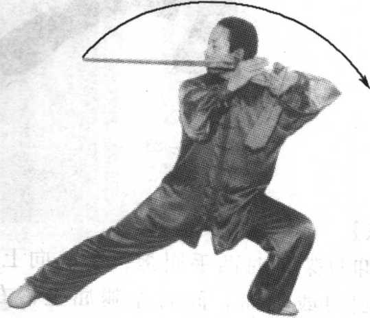 (2)扫剑时右臂以肩关节为轴,挥剑向后、向 右、向前划一平圆,力达剑刃。