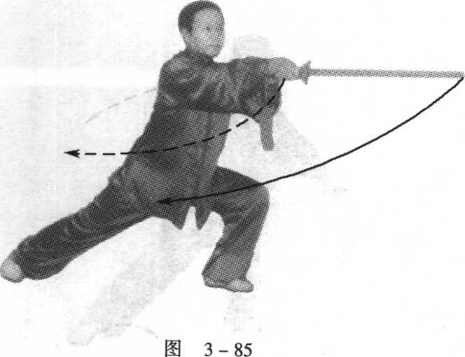上体左转;右手持剑向左前方平劈,左手剑指 一 第 仍附于右腕;眼看剑尖(图3-85)。 5
