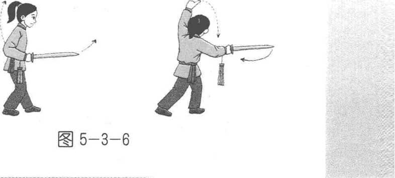 (2) 左剑指向左、向上,绕至左上方,手心斜向上,臂 要撑圆,目视剑尖。