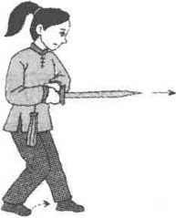(1) 左脚向左前方迈出,脚跟着地,随之重心前移,呈 左弓步,同时上体左转,右手持剑从右腰间向左前 方刺出,手心向上,力注剑尖;