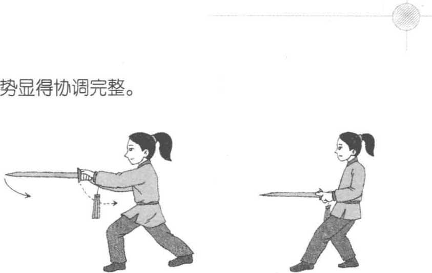 (2) 同时右手翻掌,手心向上,并将剑向左平带,剑尖 略高,力达剑刃;