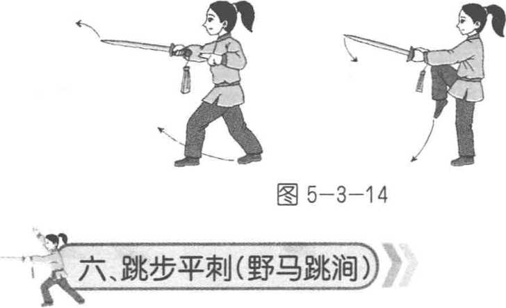 跳步平刺(野马跳涧)包括落脚收剑、捧剑前刺、跳 步分剑和弓步平刺等。
