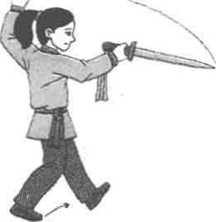 (2) 同时右手持剑经下划弧向前上方栏出,手心向外, 高与头平,剑尖略低,剑身斜向内;