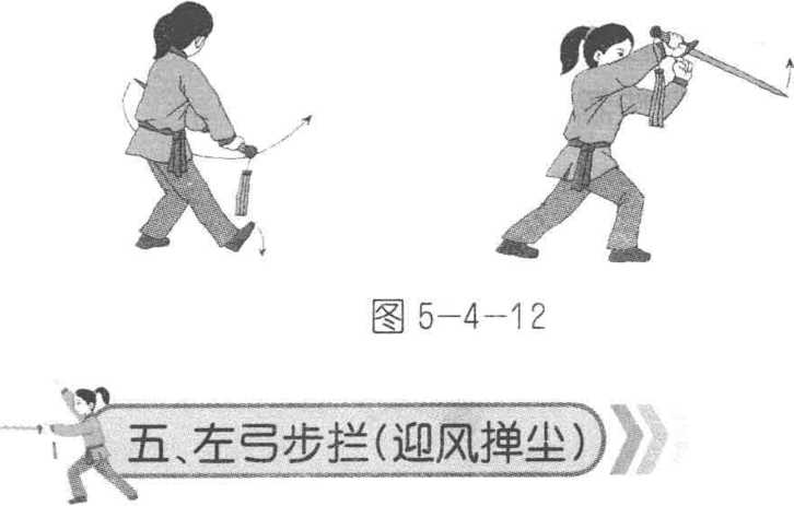 左弓步栏(迎风掸尘)包括撇脚绕剑、收脚绕剑和弓 步拦剑等。