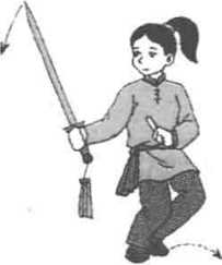 (2) 右手持剑向后(正西)立剑平刺,手心向体前(南方, 起势方向);