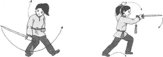 (2) 同时右臂屈收,经头侧向前反手立剑刺出,手心向