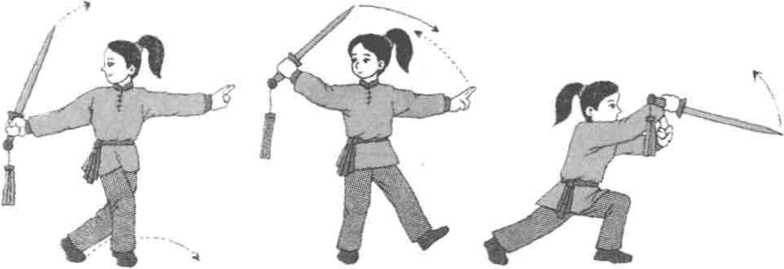 (2) 同时右手持剑挥臂划弧向前上方栏出,手心斜向内, 高与头平,剑尖略低,剑身斜向内;