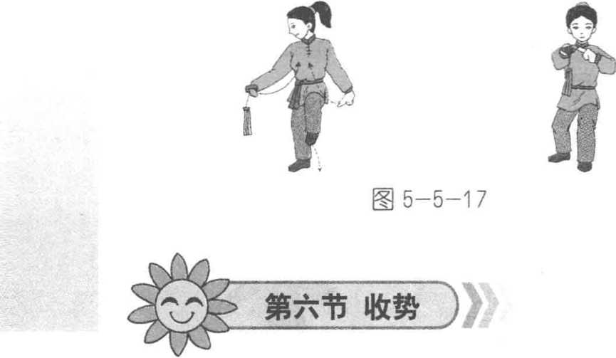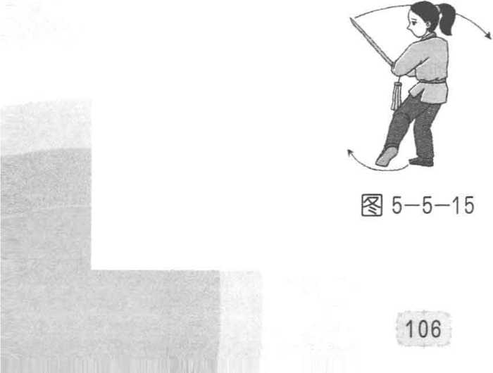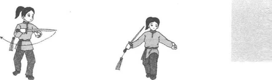 图 5_5—16平转体,弧形带剑,剑尖朝前。