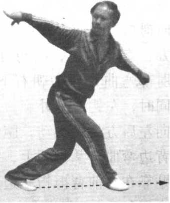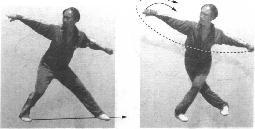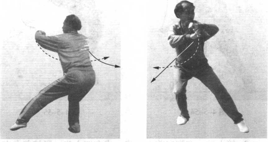 2 .接上动。左脚向后倒插步,成右麻花步;目仍视左钩 (图4-5-48 )o
