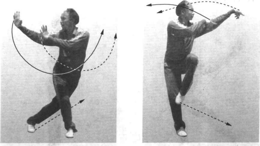 方划弧伸出,掌心朝左,高与眉平,肘部微屈,肘尖朝下;左 掌向前下方划弧伸至右肘内侧,掌心朝右,肘部弯曲,肘尖朝 左下方,双腕向拇指边弯曲,掌指朝上;目视右掌(图4-5- 1fc