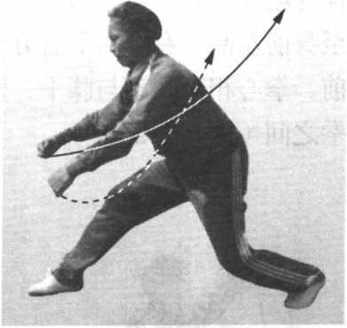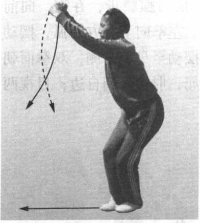 2 .接上动。右脚向前进一步,成右麒麟步,吞胸,向前 探身塌腰;双拳随着探身塌腰齐动,左拳向下左方划弧,摆动 至身前左侧;右拳向下右方划弧,摆动至身前右侧,双拳面朝 前,拳心相对,高与膝平,双肘微屈,肘尖各朝自边;目视两 拳之间(图4-6-26 )o