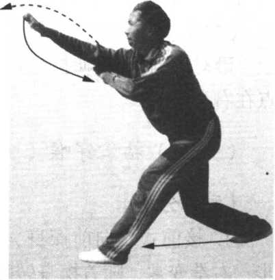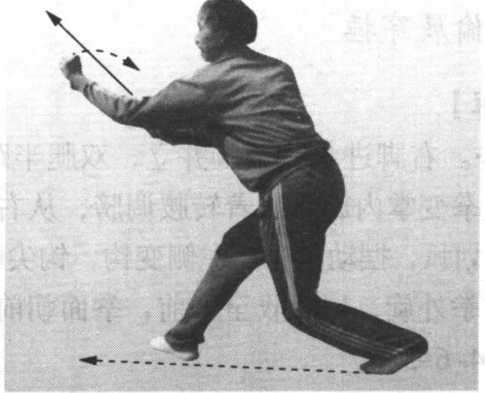 5 图 4-6-29图 4-6-29.接上动。向右转腰拧 胯调膀,身向后侧,腿成右寒 鸡势;右拳内旋,随着转腰侧 身,屈肘向左、向后、向上方 划弧,摆动至身左侧,拳面朝 左后方,拳心朝下,高与耳 平,肘尖朝前下方;同时,左 拳变掌内旋,屈肘向左、向 后、向上方划弧摆动,腕向掌 背边弯曲,掌指朝上,掌心贴 靠在右前臂内侧,肘尖朝后; 目视前方(图人29 )。