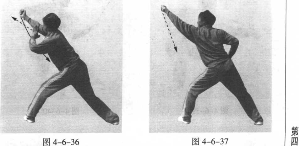 1 .接前势。向前探身,向右转腰拧胯调膀;左掌变拳,随 着转腰调膀向前上方冲出,腕向拇指边弯曲,拳面朝右前方, 拳心朝下,高与头平;同时,右拳外旋,屈肘收至腰间抱拳, 拳面朝前,拳心朝上,肘尖朝后;目视左拳(图4-6-37)。