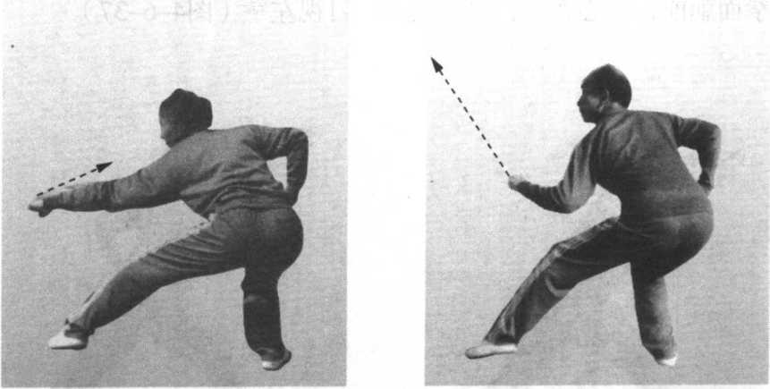 3 .接上动。向右转腰拧 胯调膀;左拳随着转腰直臂 向前方冲出,拳面朝前,拳 心朝下,高与胯平;同时, 腿成右寒鸡势;目视左拳 (图4-6-39 )o