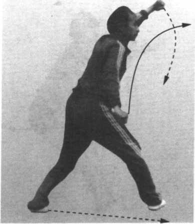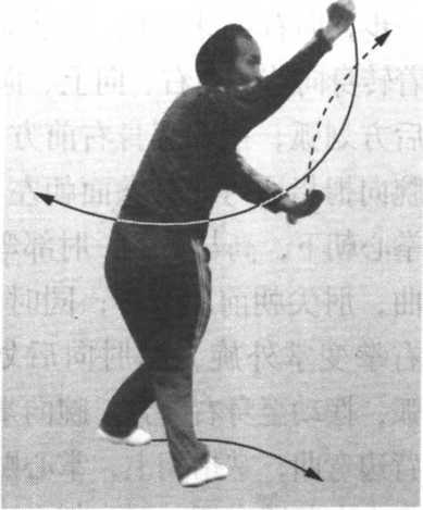 8,接上动。右脚向前进半步,左脚跟半步,腿仍是右麒 麟步,紧接着腰由左转变右转,并向前探身塌腰;右拳随着转 腰探身,向后、向上、向前方划弧,摆动至身前,腕向拳心边 弯曲,拳面朝上,拳心朝后,比头稍高,肘部弯曲,肘尖朝 下;同时,左掌向前下方划弧,摆动至右肘内侧,腕向拇指边 弯曲,掌指朝上,掌心朝右,肘部弯曲,肘尖朝左下方;头向 左后方转动;目视后方(图4-6-84)。