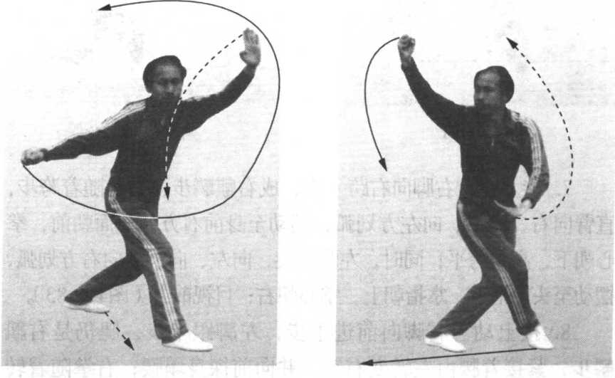 6 .接上动。左脚倒插上一步,成右麻花步;右拳随着步的倒