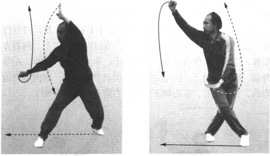 7 图 4—6—81 图 4—6—82图 4—6—81 图 4—6—82.接上动。右脚向右跨一步,成右麒麟步;右拳随着跨步, 直臂向右、向下、向左方划弧,摆动至身前右方,拳面朝前,拳 心朝下,高与跨平;同时,左掌外旋,向左、向上、向右方划弧, 摆动至头前上方,掌指朝上,掌心朝右;目视前方(图『643)。