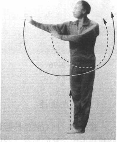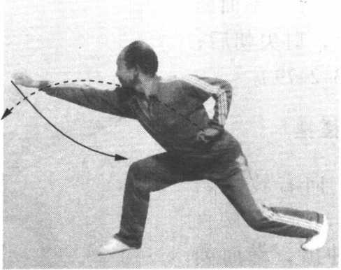 接前势。向右转腰调 膀;左拳内旋,随着转腰直 臂向前上方冲出,拳面朝 前,拳心朝下,高与鼻平; 右拳外旋,屈肘收至腰间抱