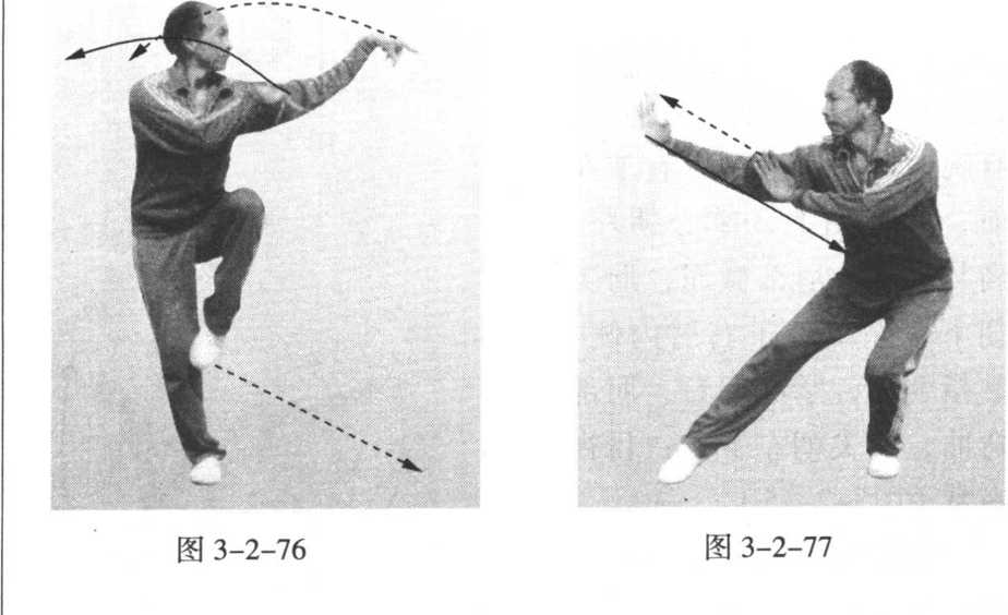 右膝内前侧,脚尖朝下,脚掌朝后,成右锦鸡独立势;目视左 钩(图 3-2-76)。