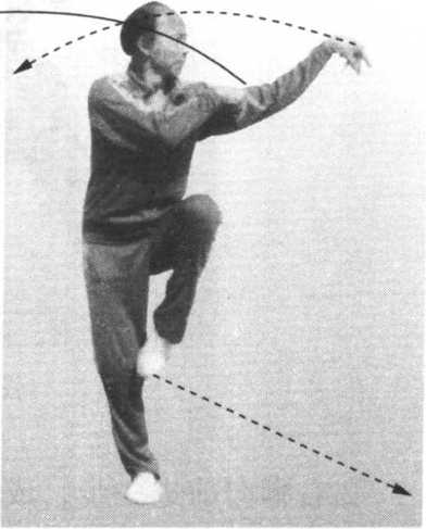 3 .左脚向后落地,成右 寒鸡势,紧跟向右转腰拧胯 调膀;同时,双钩变掌,右 掌内旋,随着转腰向前上方 划弧伸出,腕向拇指边弯曲, 掌指朝上,掌心朝左,高与 眉平,肘部微屈,肘尖朝下; 左掌外旋,向前下方划弧伸 至右肘内侧,腕向拇指边弯 曲,掌指朝上,掌心朝右;