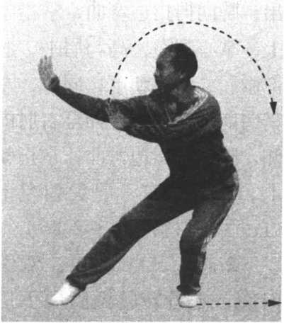 自内旋,右掌向前上方划弧伸 出,腕向拇指边弯曲,掌指朝 上,掌心朝左,高与眉平,肘 部微屈,肘尖朝下;同时,左 掌向前下方划弧,伸至右肘内 侧,腕向拇指边弯曲,掌指朝 上,掌心朝右,肘尖朝左下 方;目视右掌(图3-2-86)。