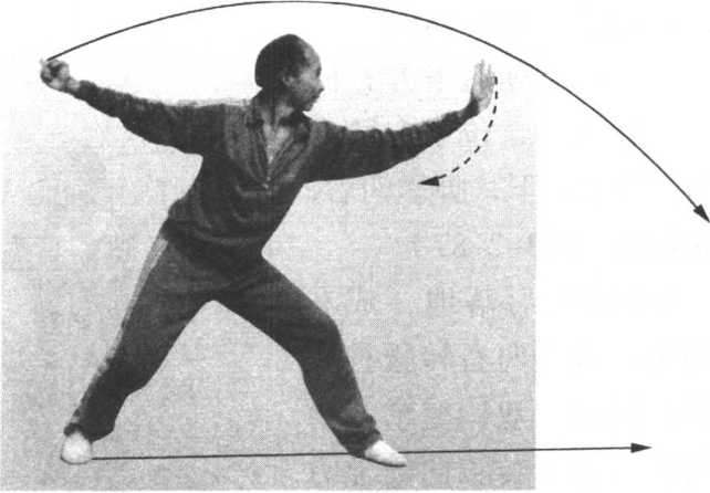 拳面朝上,拳心朝后,高与 头平;同时,左拳屈肘收至 右肘下方,拳面朝右,拳心 朝下,肘尖朝左下方;目视 右拳(图3-2-92)。