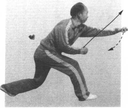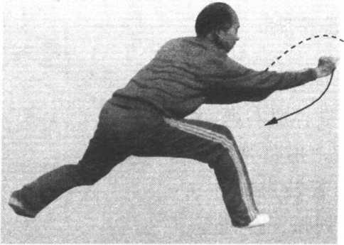 2 .向左转腰拧胯调膀; 右拳外旋,随着转腰向前上 方崩出,腕向拳心边弯曲,