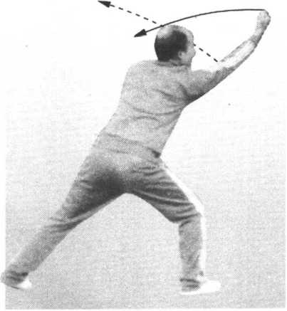 1.接前势。左脚后退半 步,脚尖朝后,紧接向左转 身180。;右掌变拳;左掌内 旋,随着转身直臂向上后方 划弧,摆动至身前,腕向拇 指边弯曲,掌指朝上,掌心 朝右,高与鼻平;目视左掌 (图3-2-89 )o