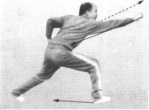 接前势。右脚向前进半 步,成右麒麟步,紧接向左 转腰调膀;右拳内旋,随着 转腰直臂向前上方冲出,拳 面朝前,拳心朝下,高与鼻 平;同时,左拳外旋,屈肘