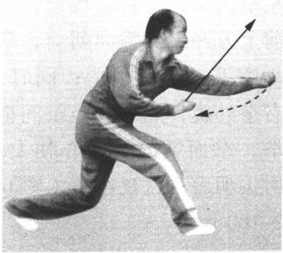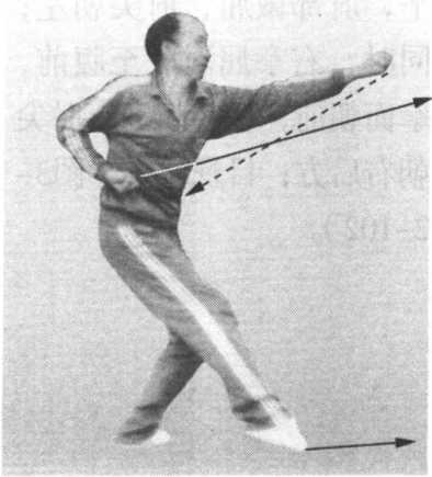 接前势。右脚向前进半 步,成右麒麟步,向左转腰 调膀;右拳内旋,直臂向前 上方冲出,拳面朝前,拳心 朝下,高与鼻平;同时,左 拳外旋,屈肘收至腰间抱 拳,拳面朝前,拳心朝上, 肘尖朝后;目视右拳(图 3-2-101 )o