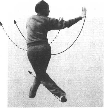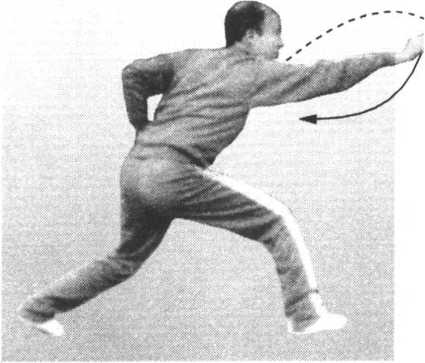 1 .接前势。向后侧身, 成右寒鸡势;左拳外旋, 肘部弯曲,前臂竖起,向 左、向上、向后方划弧, 摆动至身后,拳面朝上, 拳心朝右,比头稍高,肘 尖朝下;同时,右拳外旋, 肘部弯曲,前臂竖起,向 后下方划弧,摆动至左耳 左侧,拳面朝上,拳心朝 右,肘尖朝下;目视前方 (图 3-2-104 )o
